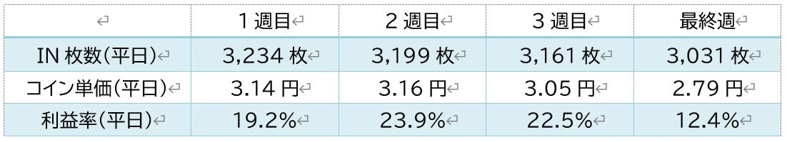 一般的に利益率は平日を低めとし週末は利益を求めるので高くなりますが、ほとんどのお店でコイン単価は「出しているはず」の平日のほうが高くなります。