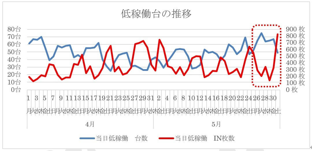 平均稼働の3分の1を下回る稼働の台を低稼働台と定義し、その台数および低稼働台だけのIN枚数をグラフ化したものが上記です。最終週の平日(26日~)は低稼働台の台数がそれまでよりも増え(青ライン)、IN枚数が低下している(赤ライン)ことがわかります。