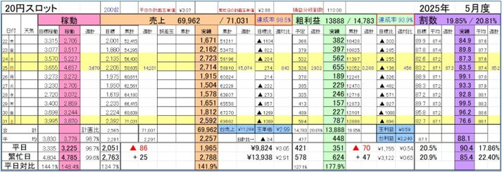 「24日(土)現在のパチスロ部門の粗利は計画比▲255千円で、最終週で頑張れば計画達成できそうです。なので、月曜日からの最終週はALL①で営業します。」